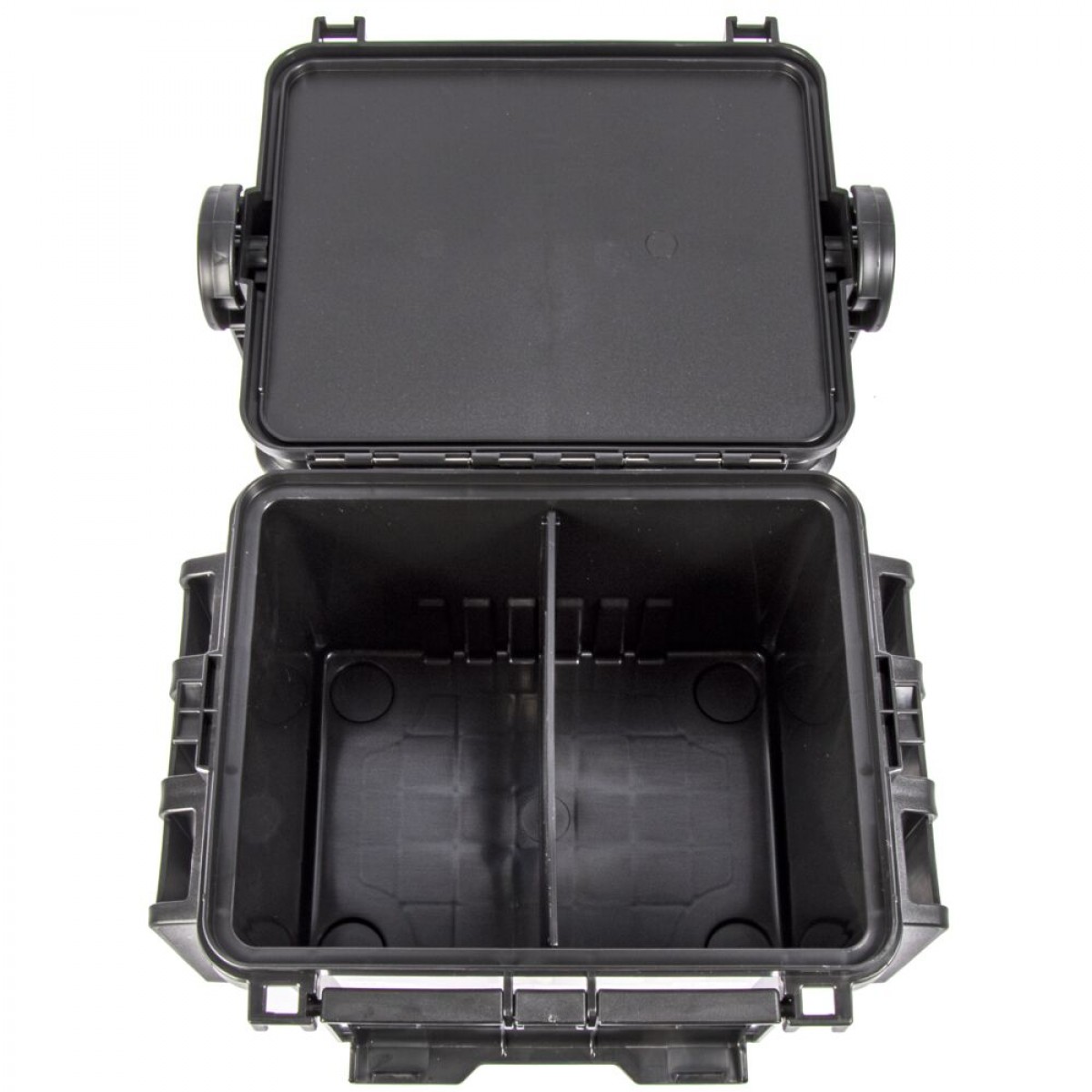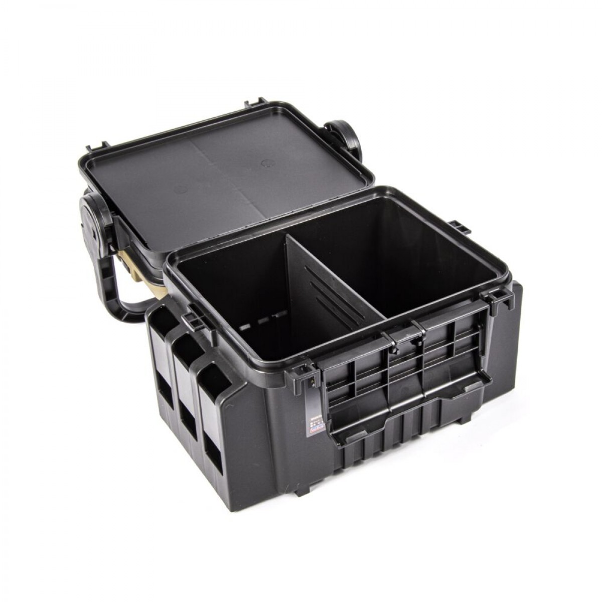 Под откидной крышкой на неубиваемых петлях расположено два отделения различного размера, разделенных горизонтальной псевдокрышкой. В комплектацию входят съемные вертикальные разделители, позволяющие зонировать внутреннее пространство.