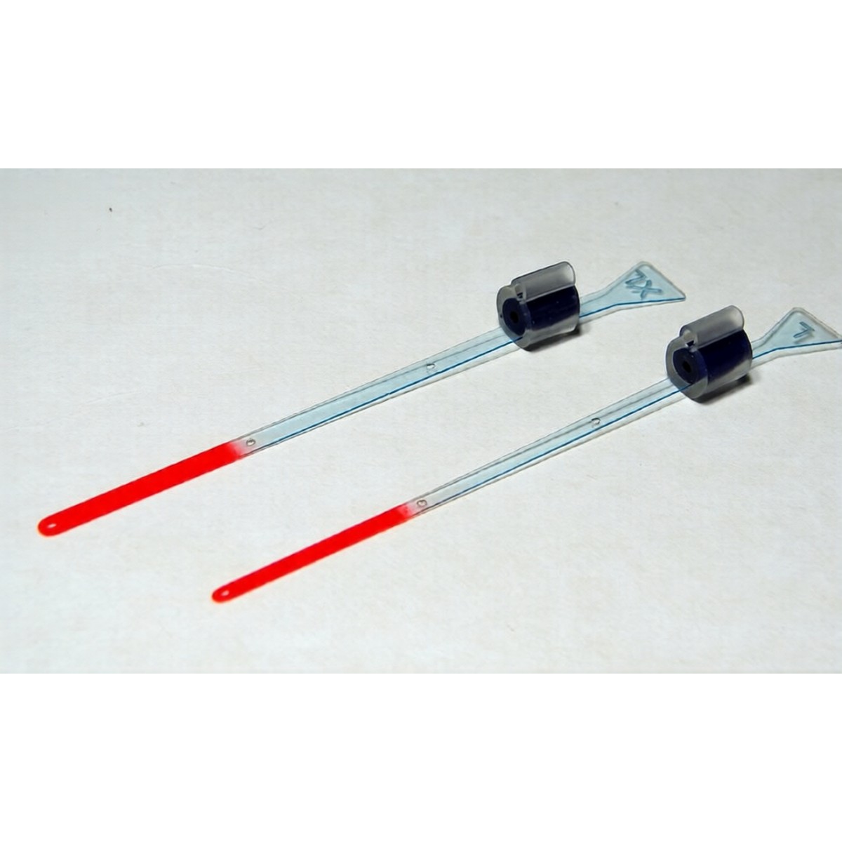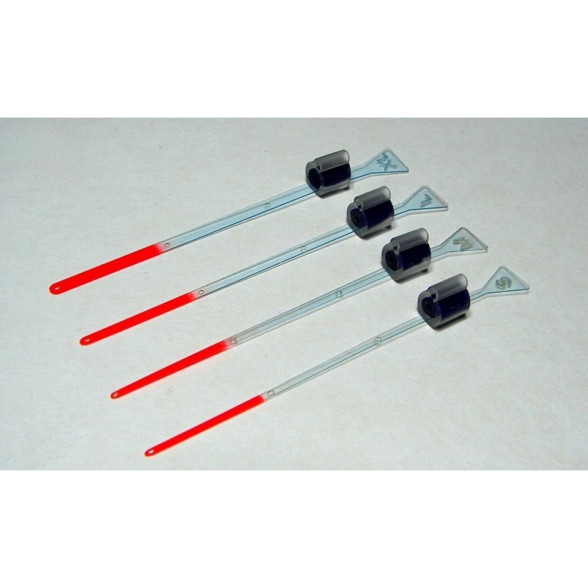 В каждом виде кивков по 4 размера: «ХL» (тест 0,7-1,1 гр), «L» (тест 0,5-0,85 гр), «M» (тест 0,45-0,65 гр), «S» (тест 0,2-0,45 гр). Размеры различаются разной конусностью, которая рассчитана под разные веса/размеры мормышек. Длина у всех кивков одинаковая - 90 мм.