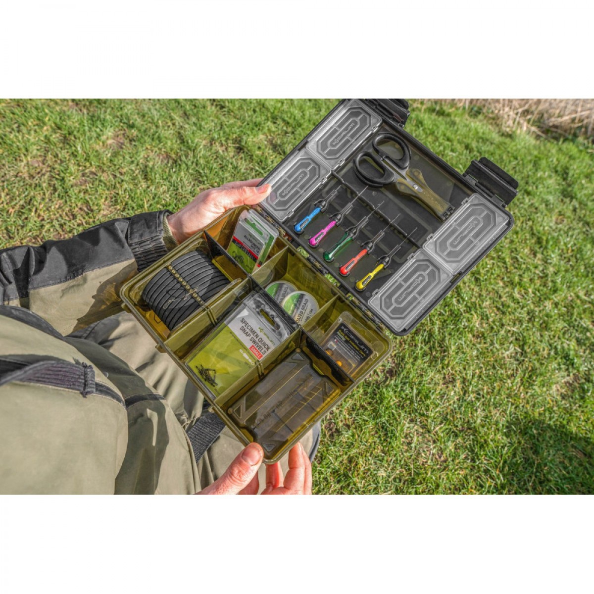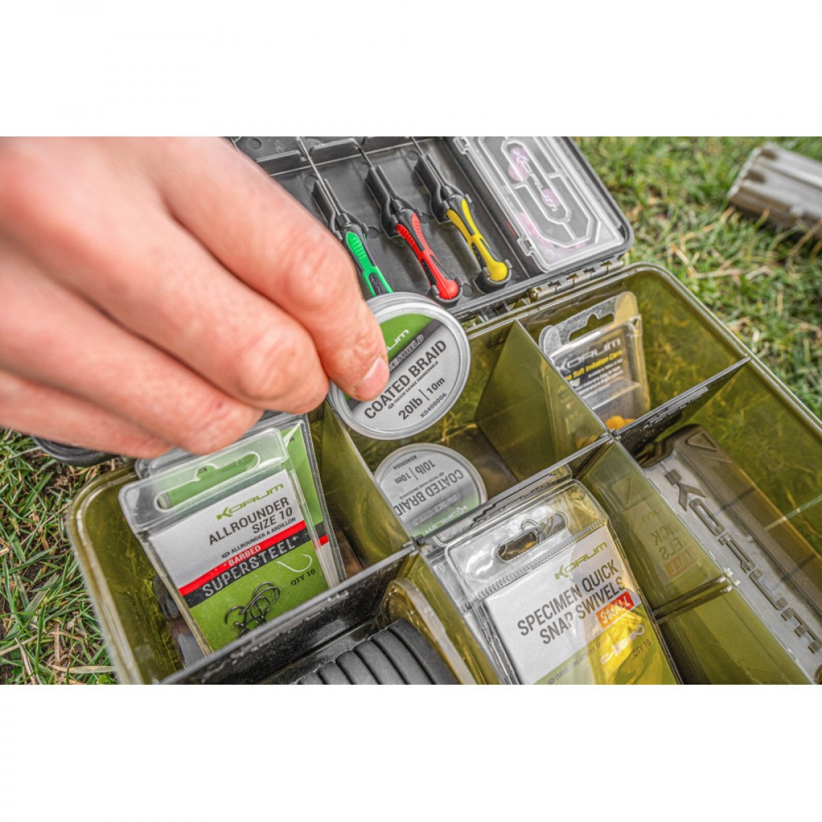 Korum BLOX — это новая идея для хранения рыболовных снастей, ориентированная на универсальных рыболовов. Разработанная для размещения всего необходимого в одном высокоорганизованном месте. Разработчики Korum тщательно рассчитали размер BLOX для размещения необходимых предметов и аксессуаров для изготовления и хранения оснасток, поводков, такие как катушки с леской, наборы крючков и другие принадлежности. Помимо ячеек для хранения мелочей, в коробке имеются инструменты: ножницы, поводочница, пять иголочек, коробочка Bits Blox. Ножницы и иглы надежно фиксируются на крышке коробки, таким образом, инструмент всегда будет под рукой и на своем месте. Коробка выполненный из ударопрочного пластика, а также она оснащена резиновым уплотнителем для защиты от влаги и пыли. Размеры коробки - 250х196х91 мм. Коробка для аксессуаров с инструментом для карпового монтажа Korum включает в себя: - 1 коробочку для аксессуаров Korum Bits Blox 4 Slot - 1 поводочницу - 5 игл - 1 ножницы