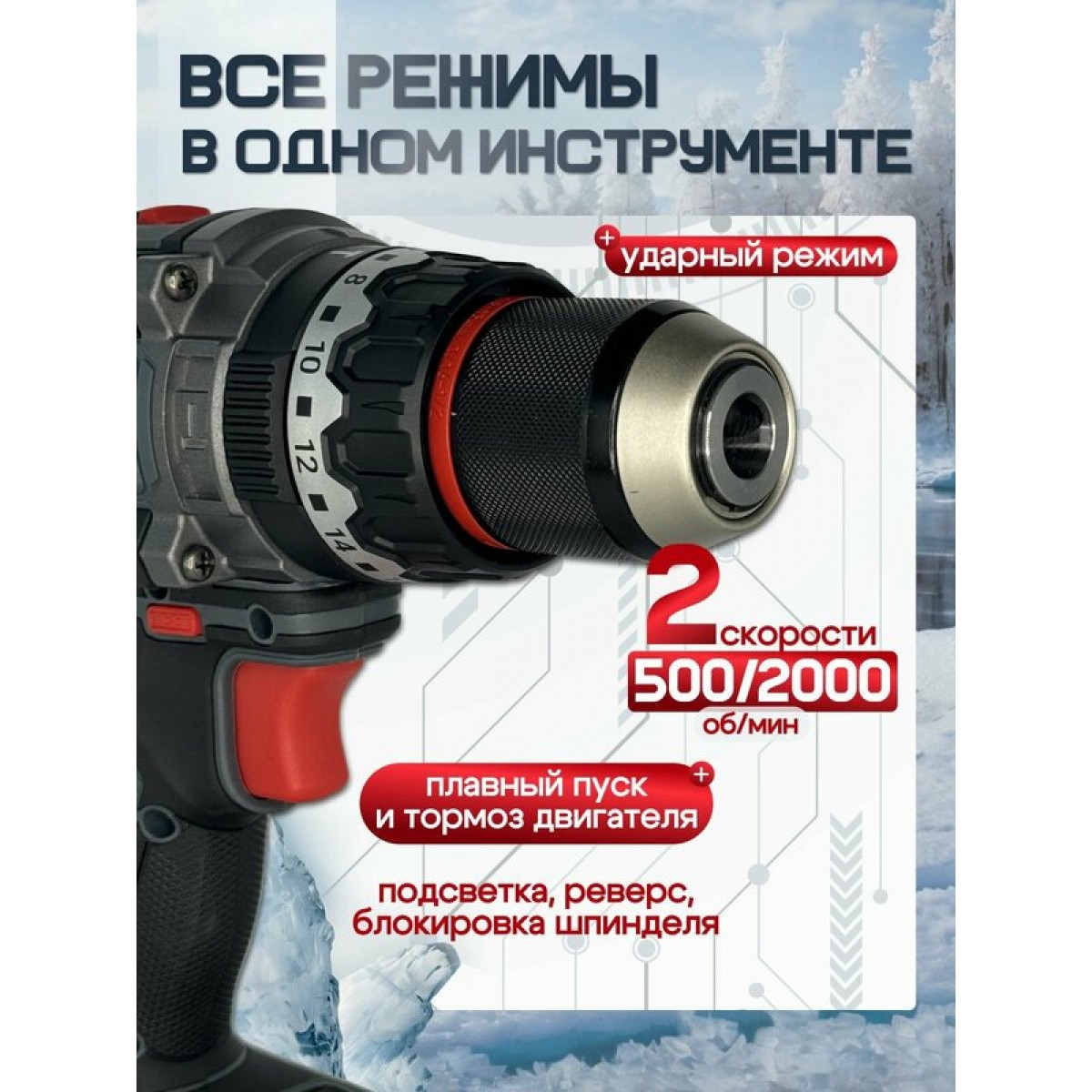 Особенности: Бесщеточный, ударный режим, подсветка, реверс, блокировка от случайного включения, быстрозажимное крепление, защита от перегрузок, плавное изменение скорости.