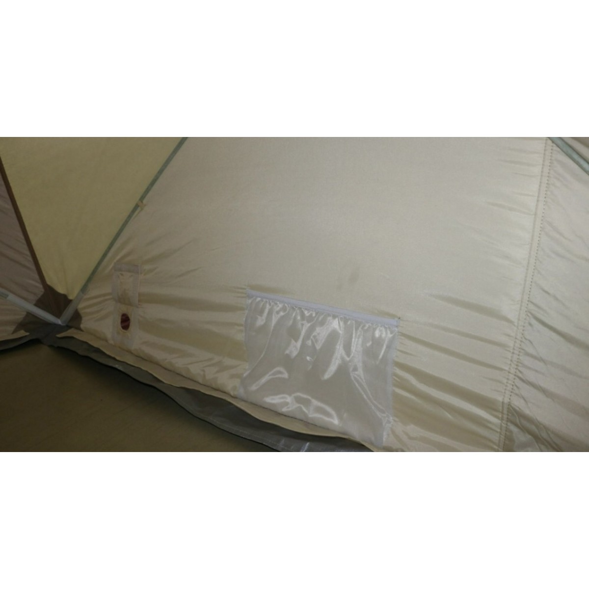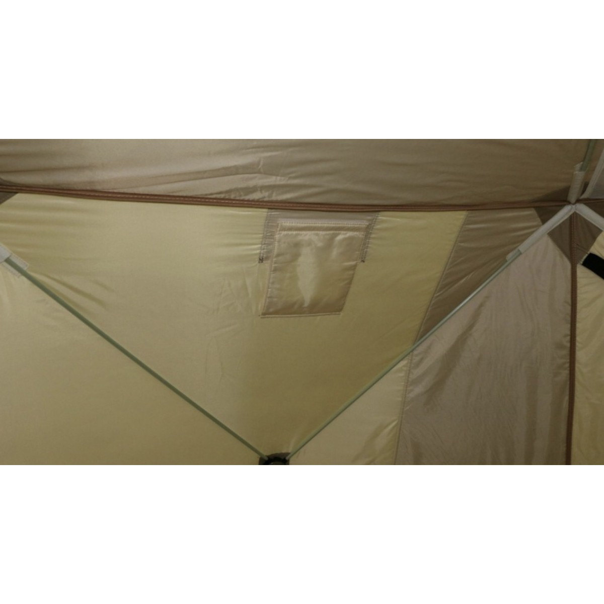 Стены палатки изготовлены из двух слоев водоотталкивающей ткани, между которыми находится толстый слой утеплителя. Все это соединено между собой не сквозной термостежкой, как у большинства производителей, а по новой технологии, благодаря чему отсутствуют мостики холода, характерные для сквозной термостежки.